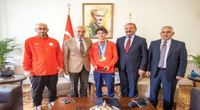 Romanya’da düzenlenen Gençler ve Yıldızlar Dünya Plaj Güreşi Şampiyonası’nda birinci olan Miraç Saraç, İzmir Büyükşehir Belediye Başkanı Tunç Soyer’i ziyaret etti.