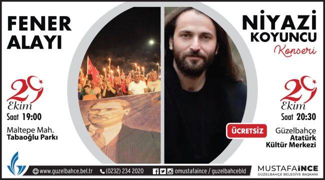 Resmi törenlerle başlayacak olan 29 Ekim Cumhuriyet Bayramı, resmi törenlerin ardından meşaleli yürüyüş ile devam edecek. Saat 19.00’da Maltepe mahallesi Tabaoğlu Parkı’ndan başlayacak olan kortej Güzelbahçe Atatürk Kültür Merkezi’nde son bulacak. Kortej sonrası ise Karadeniz’in sevilen sesi Niyazi Koyuncu, Güzelbahçeliler için 20.30’da sahne alacak. Konser, tüm halk için ücretsiz olacak.