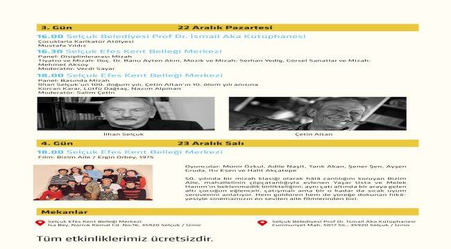 Festivalin üçüncü günü 22 Aralık Pazartesi, saat 16.00’da Prof. Dr. İsmail Aka Kütüphanesi ve Sosyal Etkinlik Merkezi’nde Mustafa Yıldız tarafından gerçekleştirilecek “Çocuklarla Karikatür Atölyesi” ile başlayacak. Saat 16.30’da Selçuk Efes Kent Belleği’nde düzenlenecek “Disiplinlerarası Mizah” panelinde;